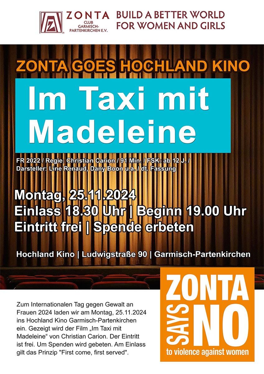 In diesem Jahr beginnen wir am Vormittag mit der Einweihung einer weiteren orangefarbenen Bank auf dem Gelände der St. Irmengard-Schulen. Abends laden wir dann wieder alle Kinogänger ins Hochlandkino ein und freuen uns auf ein volles Haus mit dem Film "Im Taxi mit Madeleine".